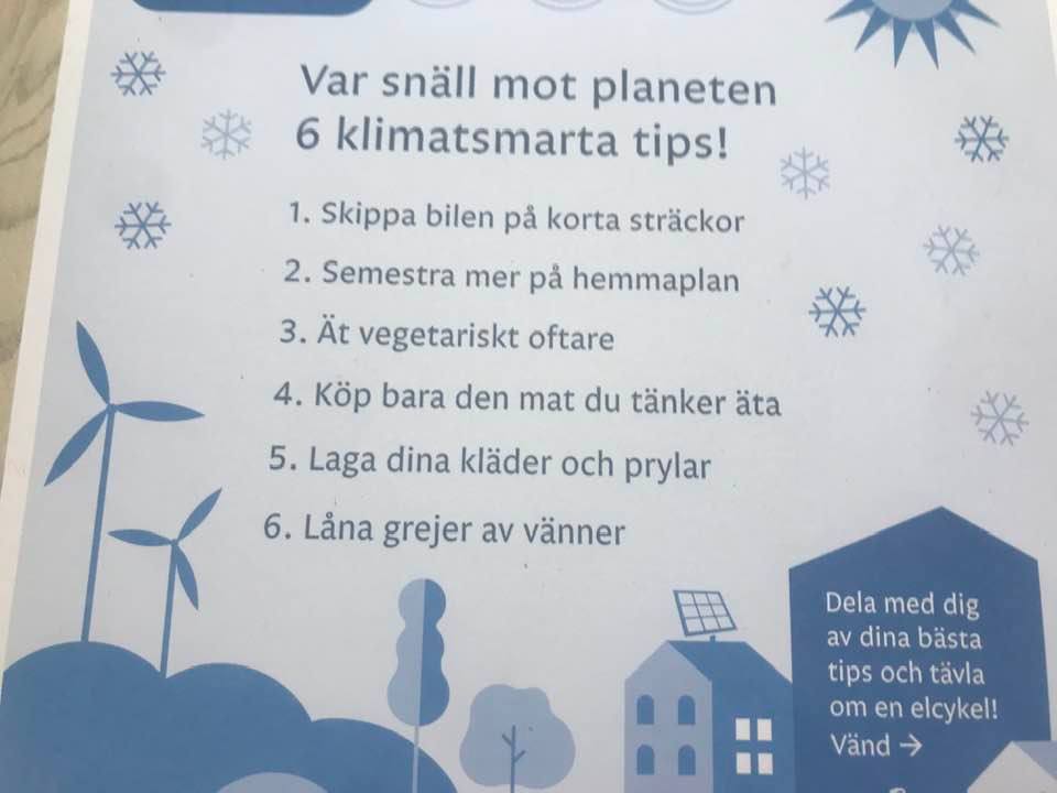 Givetvis tar man också tillfället i akt att uppfostra undersåtarna. Det blev en god vän varse nyligen när hennes hemkommun skickade ut ett antal pekpinnar och förmaningar inför helgen. Under rubriken ”Var snäll mot planeten – 6 klimatsmarta tips!” stod följande att läsa: