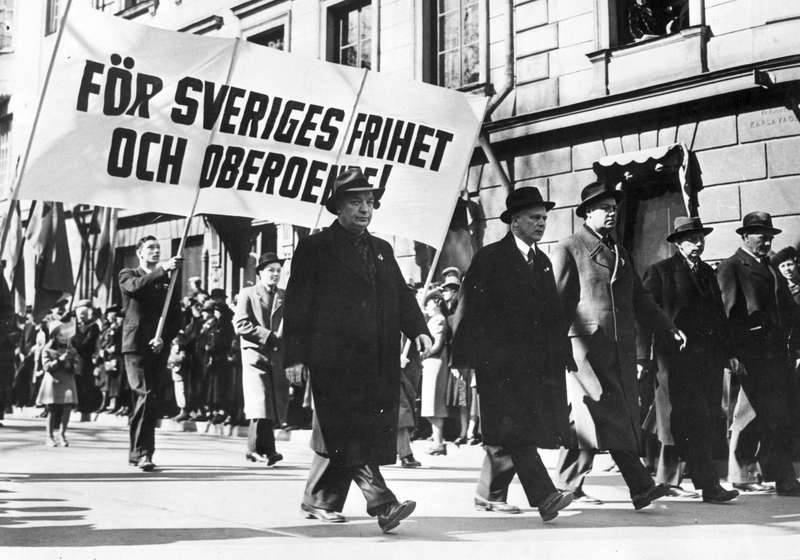 Så kunna vi i dag hälsa vår blågula fana icke blott i den befriande känslan av en överstånden fara utan jämväl i starkare medvetande om en levande svensk vilja och förmåga till nationell hävdelse, till beslutsamt värn kring fosterlandet och dess dyrbara värden. Leve fosterlandet, leve Sverige!