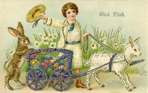 ”Dessa har sedan tagits över som påsksymboler när kristendomens intåg gjorde att germanerna började fira påsk i stället. Ēostre skall ha firats kring vårdagjämningen den 21 mars, ungefär vid samma tid då påsken tidigast kan infalla, och månaden april skall på den tiden ha burit hennes namn.”