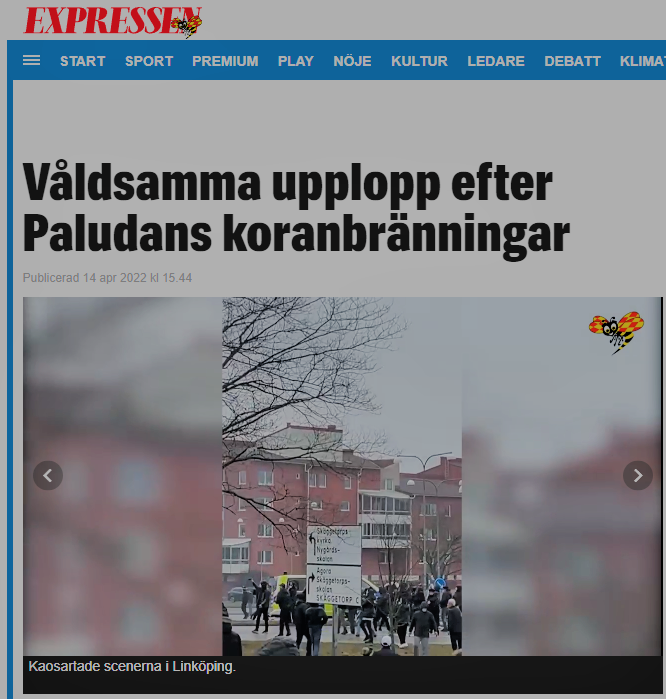 Hon säger det med mycket allvarlig röst, med fokus på Paludans islamkritik, och det är uppenbart att Expressens vinkling är att det är han som orsakar kaoset genom att överhuvudtaget kritisera islam. Inte ett ord om respektlösheten för våra lagar hos dem som startar upplopp, slår sönder polisbilar och skadar poliser.