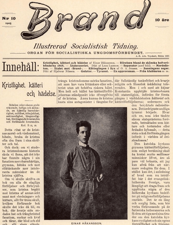 I ett gammalt nummer av den anarkistiska Tidningen Brand, nr 10/1905, hittade jag en artikel av ungsocialisten och ateisten Einar Håkansson (1883-1907). Tidningen var då organ för Socialistiska ungdomsförbundet.