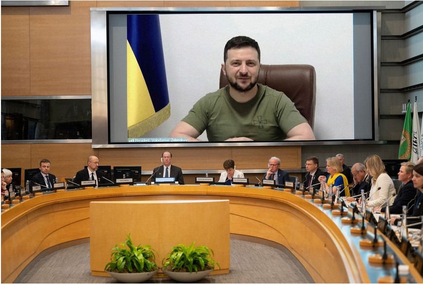 Ukraina kommer att behöva en motsvarighet till Marshall-planen för sin återuppbyggnad säger ordföranden för European Bank for Reconstruction and Development (EBRD). EBRD är ungefär som International Bank for Reconstruction and Development, Världsbanken, som bildades 1944 för att administrera Marshall-hjälpen. EBRD gör av med ungefär fem miljarder euro om året på olika europeiska hjälpprojekt. På bilden ser du Zelenskyi förklara för Världsbanken att Ukraina behöver fem miljarder i månaden under den närmsta tiden och sedan i runda slängar 600 miljarder dollar för ytterligare återuppbyggnad. För en tarvlig och illasinnad person som jag ser det ut som julafton för en omsättningsmaximerande organisation som EBRD. Ukrainas premiärminister Denys Shmyhal reser runt i världen och begär att länderna ger tio procent av sina dragningsrätter i Internationella Valutafonden till Ukraina – det finns ju pengar, nyligen satsades 650 miljarder dollar – ett svenskt BNP – på ”likviditetshöjande åtgärder”.