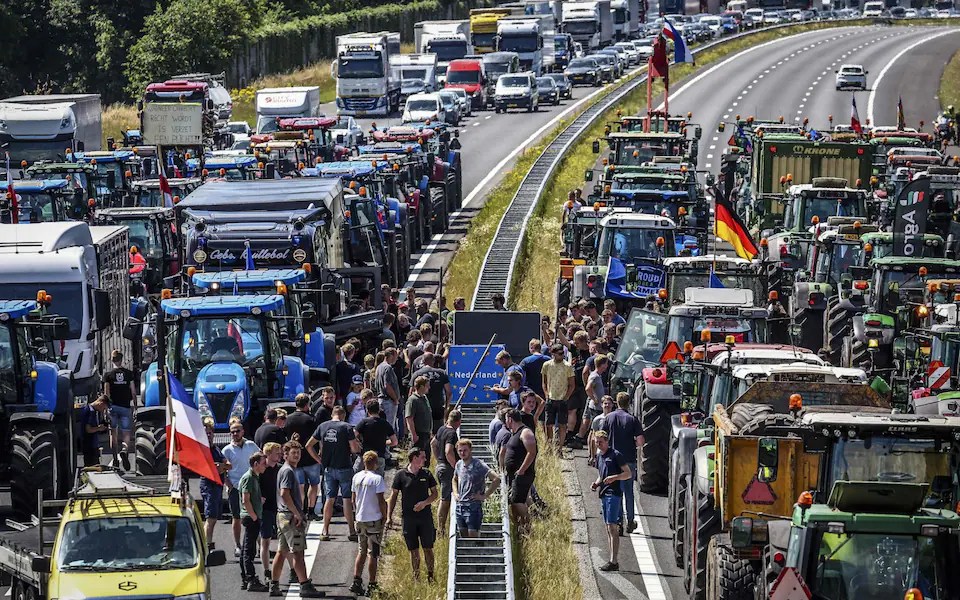 Förra månaden tillkännagav den nederländska regeringen planer på ett program för att minska kväveutsläppen med 50 procent till 2030 för att följa EU: s bestämmelser om nitratföroreningar. Enligt förslagen skulle jordbrukarna drastiskt behöva minska mängden lustgas- och ammoniakutsläpp som deras djur producerar, vilket skulle tvinga många gårdar att stänga. Tusentals arga holländska bönder har använt sina traktorer för att blockera hamnar, flygplatser och vägar. Halmbalar har bränts på gator och gödsel har dumpats vid regeringsbyggnader (bilden).