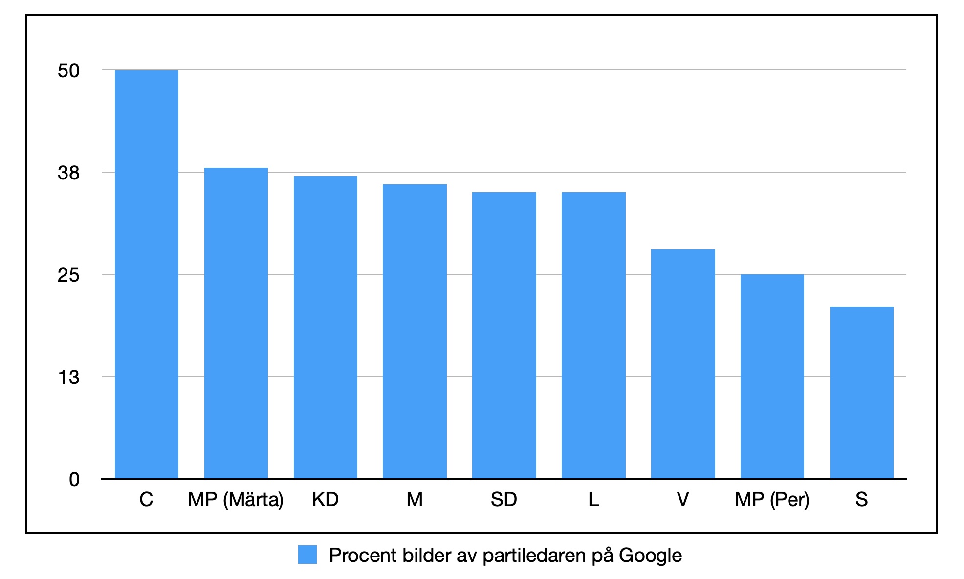 För att om möjligt få ett mer objektivt mått vänder jag mig till Google. Jag gör en bildsökning för varje parti och för de 100 första bilderna, räknar jag hur många som föreställer partiledaren.