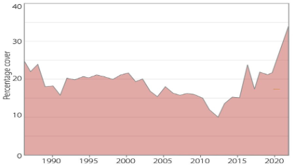 Här är Ridds diagram över korallutvecklingen, man ser tydligt vändningen uppåt från 2012, alltså för 10 år sedan: