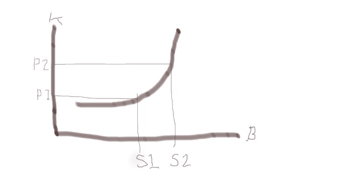 Titta på den fula skissen som jag ritat själv för att illustrera hans tankegång. Tänk dig att landets jordbruksmark fördelas på den vågräta axeln B efter fallande bördighet. Den bästa jorden ligger alltså vid origo. Den bananformade kurvan visar sambandet mellan bördighet och produktionskostnad på den lodräta axeln K.