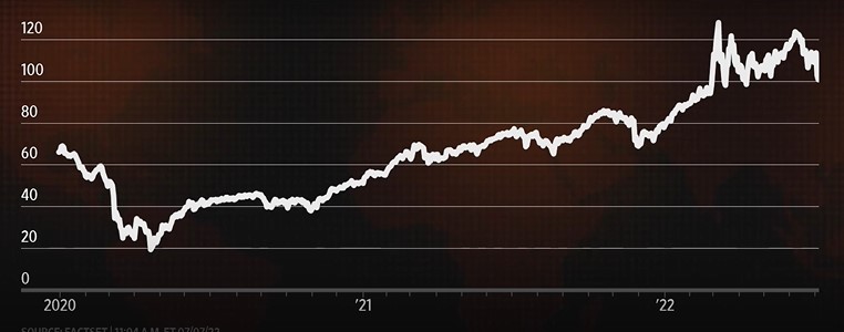 Kurvan (se bilden ovan) visar priset i dollar per fat Brentolja (en standardsort). När coronat härjade som värst våren 2020 tänkte folk inte så mycket på bensin och priset sjönk till tjugo dollar per fat. Sedan dess har priskurvan varit stadigt stigande till dagens hundra dollar fatet utan några överraskningar utom ett antal nervösa men övergående darrningar i samband med Putins anfall på Ukraina. Man kan våga sig på slutsatsen att Putin är oskyldig till de svenska energiprisproblemen.