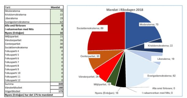 Det finns 349 mandat i riksdagen och överst i tabellen ovan finns de fyra partierna i högerblocket som efter 2018 års val besätter 174 platser och i undre delen de fyra i vänsterblocket som besätter 175 platser.