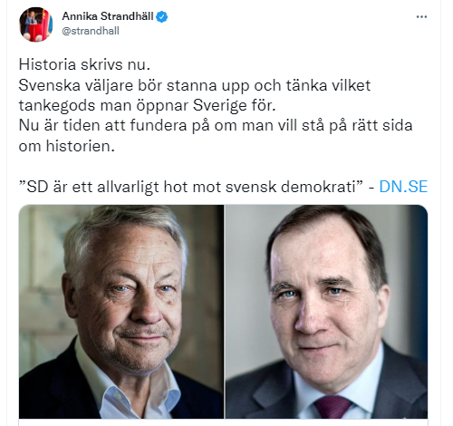 När inget annat hjälper mot opinionssiffrorna plockar Socialdemokraterna in sin avlagde partiledare, tillika en av Sveriges sämsta statsministrar genom tiderna, för att han tillsammans med Liberalernas rättrådige ålderman Bengt Westerberg ska skrämma svenska folket att rösta på vänsterblocket. Och sossarnas supertroll, Annika Strandhäll, twittrar förstås om den fantastiska propagandaartikeln – och om hur de väljare som tänker rösta för ett regeringsskifte i princip gör sig skyldiga till brott mot mänskligheten. Skamlöst är bara förnamnet – klassiskt sosseri med andra ord.