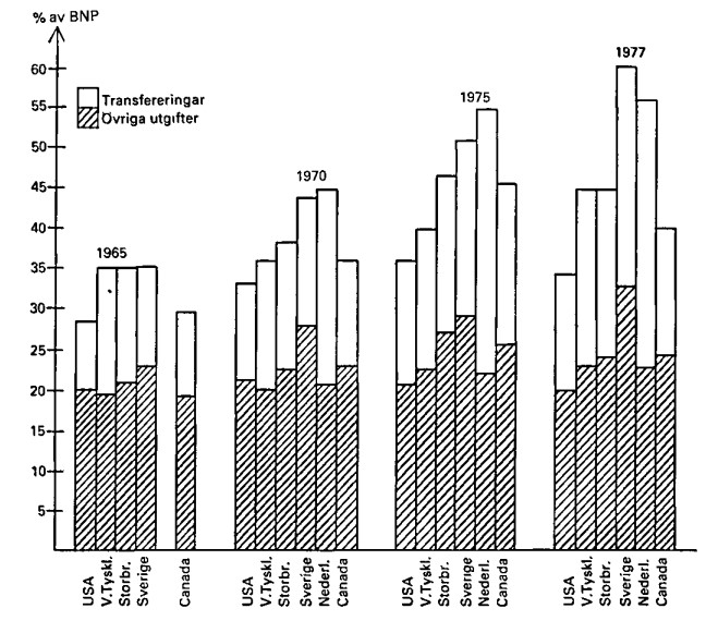 Diagrammet visar utvecklingen av den offentliga sektorns andel av BNP i olika länder under tolvårsperioden 1965 – 1977. Nederländerna och Sverige leder ligan med Sverige som slutgiltig vinnare. På dessa tolv år ökades det offentligas andel av Sveriges BNP från 35 procent till 60 procent, en närmast ofattbart snabb tillväxt.