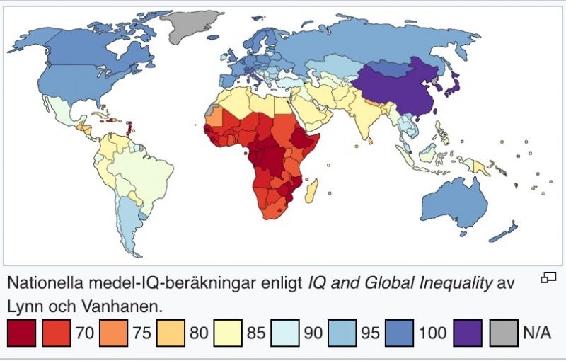 Angår dessa kartläggningar oss? Jag tror det. Under många år har vi tagit emot invandrare från Afrika och Mellanöstern, regioner i vilka befolkningen har en låg IQ och länderna lågt välstånd och ingen demokrati (med ett par tveksamma undantag – och ett tydligt, Israel). Antagligen är därför redovisningen av Sveriges läge på IQ-kartan lite för smickrande. Någon mätning under senare är har inte gjorts. Varför mäta det som skulle skada landets anseende?