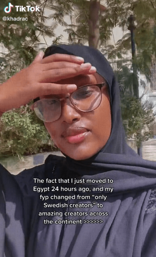 Jag upptäckte Khadra på Tiktok där hon kallar sig Khadra Carte. I ett klipp beskriver hon på svenska sin starka kärlek och längtan till moderlandet Somalia.