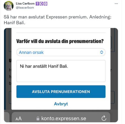 Den före detta moderata politikern Hanif Bali har blivit krönikör på Expressen. Han ska skriva en krönika varannan vecka, något som skapat storm på Twitter och fått värdegrundsmaffian att gnissla tänder av kollektiv frustration. En av dem är miljöpartisten Lisa Carlbom, som stolt lägger upp en skärmdump som visar hela världen att hon nu avslutat sin prenumeration på Expressens premiuminnehåll på grund av Hanif Bali.