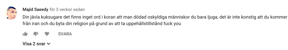 ”Din jävla kuksugare det finns inget ord i koran att man dödad oskyldiga människor du bara ljuga, det är inte konstig att du kommer från iran och du byta din religion på grund av att ta uppehållstillstånd fuck you.”