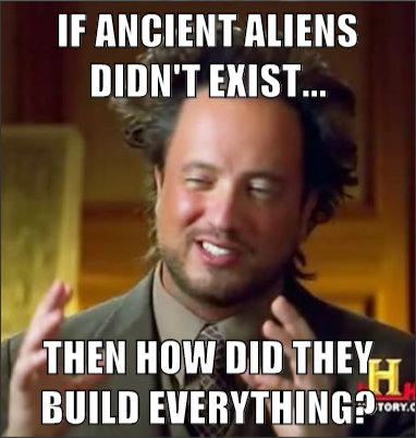 Det här kallas för forntida astronauter-teorin, eller som det heter i teveserien, forntida utomjordingar, och den går helt enkelt ut på att varelser från andra planeter kom till vår jord och hjälpte oss i vår utveckling. Pyramiderna var för svåra att bygga för korkade människor.