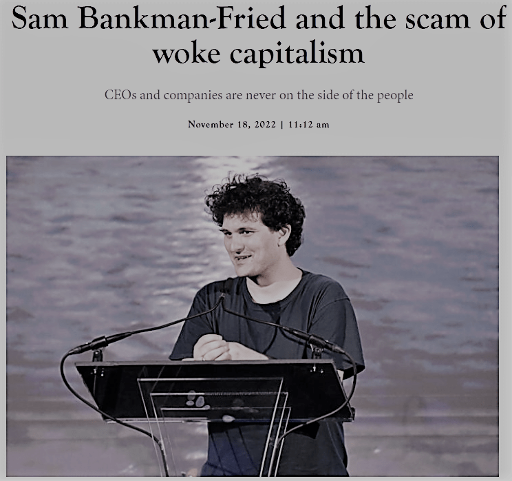 I en artikel i The Spectator World (18/11 2022) argumenterar skribenten för att ”woke capitalism” inte är något annat än en bluff. Som exempel tar man upp fallet med ”kryptomogulen” Sam Bankman-Fried.