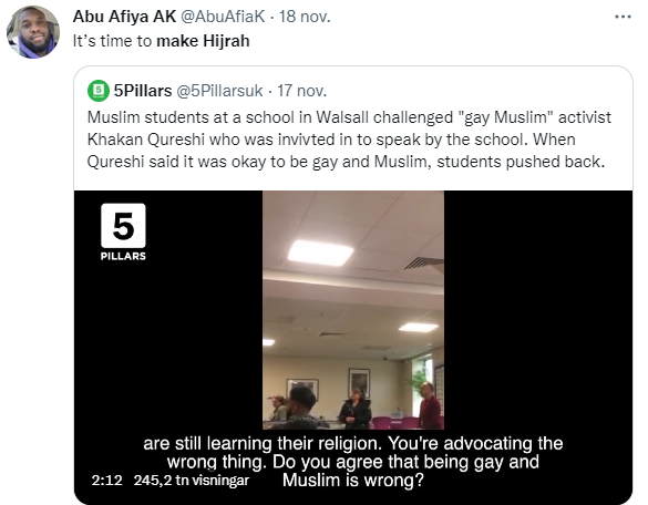 I en kommentar på Twitter skriver en muslimsk användare att det nu är dags att göra ”hijrah”, det vill säga lämna västvärlden och återvandra till islamvärlden (se vinjettbilden).