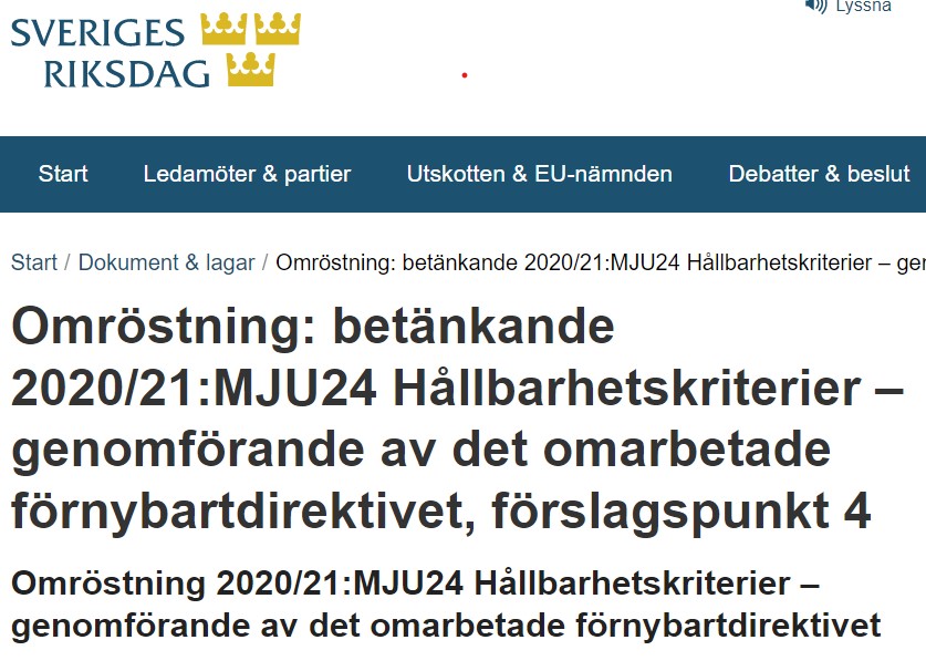 Slutligen har EU börjat bli alltmer tveksamt till biobränsle på grund av hot mot den biologiska mångfalden, genom nödvändigheten att alltmer skog måste skyddas för bevarandet av skogen som koldioxidsänka samt att se till att förhindra att företagsamma markägare inte börjar bryta torv eller annan kolrik mark. Detta framgår tydligt av miljö- och jordbruksutskottets betänkande 2020/21:MJU24 som var vad som beslutades 18 juni 2021 (https://data.riksdagen.se/fil/D0DF8458-C2C1-40A9-A67E-C7F58D0947E5)
