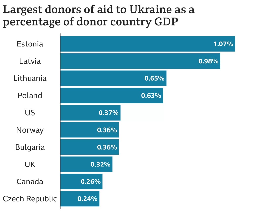 Vilka länder som själva anser sig ligga sämst till när björnen hämndlystet vaknar framgår av bilden ovan. Den visar hur stor andel av respektive lands BNP som de tio mest generösa länderna ger Ukraina. (Sverige med två promille ligger strax under Tjeckien.) Om man kan mäta krigsoro på detta sätt ligger de baltiska länderna och det alltid rysshatande Polen högst och i en klass för sig. De oroar sig antagligen inte i onödan eftersom de, till skillnad från oss svenskar, som inte haft närkontakt med ryssen på tvåhundra år, antagligen vet precis vad de kan förvänta sig av en hämndgirig Putin. Det här är ändå länder som Ryssland betraktar som sina enligt samma geopolitiska logik som Ukraina anses vara en del av Moder Ryssland. Men Sverige, vad vill Putin ha av oss sedan han väl tagit ett antal kvadratkilometer av Gotland för att bygga militär infrastruktur, flygplatser, ubåtshamnar, kommunikationsanläggningar, vodkabarer och annat som är bra för den ryska krigsmakten att ha? Vad mer kan han behöva?