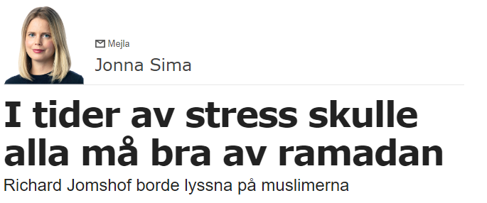 När ramadan infaller kan man stundom få se de mest absurda artiklar signerade svenska skribenter. Det finns ingenting som får de pk-marinerade journalisterna att gå igång som just ramadan. De vrider ut och in på sig själva för att visa tolerans och kärlek till islam och de lismande hyllningarna till den muslimska fastan tar aldrig slut. Nu senast Jonna Sima, kvinnan som försökte visa sig på styva linan och ifrågasätta Volvos användande av en ”manssymbol, men istället avslöjade att hon inte känner till den urgamla symbolen för järn. Den 21 mars skriver hon i en ledartext: