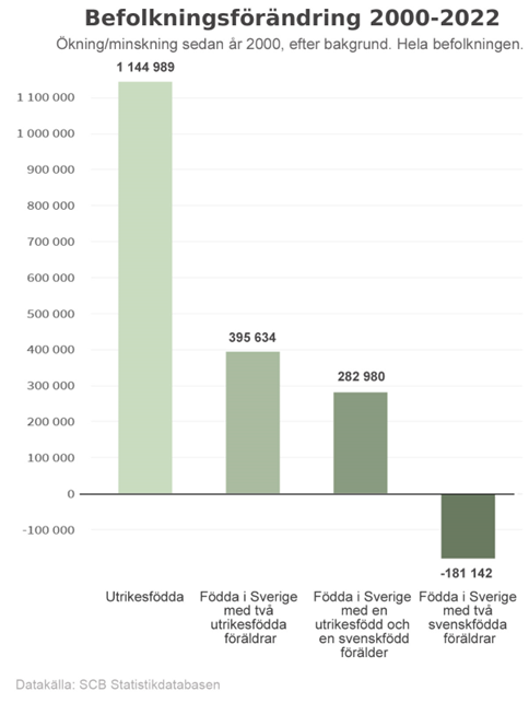 Detta är en minskning som pågår regelmässigt från år till år vad gäller både antal och andel i befolkningen med svensk bakgrund. Om vi blickar tillbaka till millennieskiftet så har personer med svensk bakgrund minskat med 40 000 medan de folkbokförda med utländsk bakgrund har ökat med närmare 1,7 miljoner. Om vi bryter ner dessa siffror mer detaljerat så kan vi i nedanstående diagram se hur det har fördelat sig mellan de olika befolkningsgrupperna. Utrikesfödda har ökat i särklass mest, och tillsammans med dem som är födda i Sverige med två utrikesfödda föräldrar är ökningen över en och halv miljon människor på 22 år. De som har två svenskfödda föräldrar har under samma tid minskat med nästan 200 000.