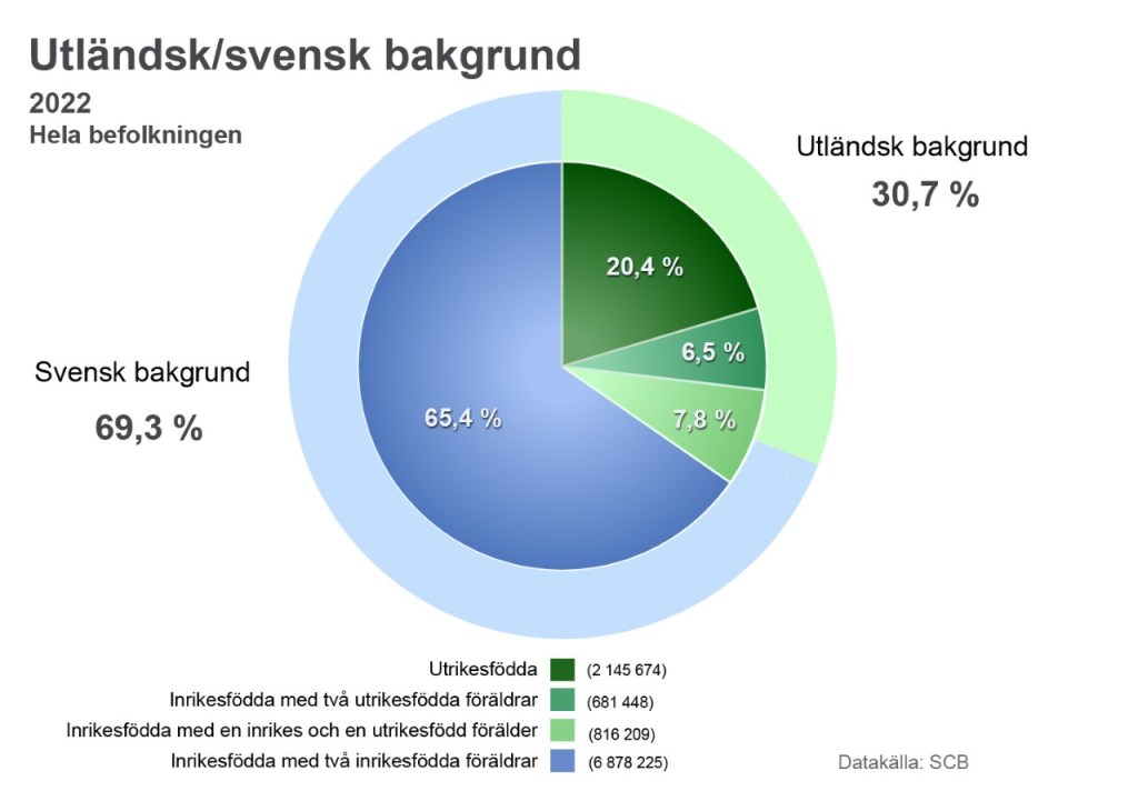 Statistiska centralbyrån (SCB) har nyligen kommit med de fullständiga siffrorna för 2022 vad gäller inhemsk respektive utländsk bakgrund i befolkningen. Ser vi till den totala befolkningen i det första diagrammet nedan, så har knappt 70 procent av alla de som är folkbokförda i landet svensk bakgrund medan drygt 30 procent har utländsk bakgrund. Vi har då räknat 50/50 bland dem som har en utrikes- och en inrikesfödd förälder. Den ”pursvenska” befolkningen med två inrikesfödda föräldrar utgör nu mindre än två tredjedelar av totalen (där kan även tredje generationens invandrare ingå, men det redovisas inte).