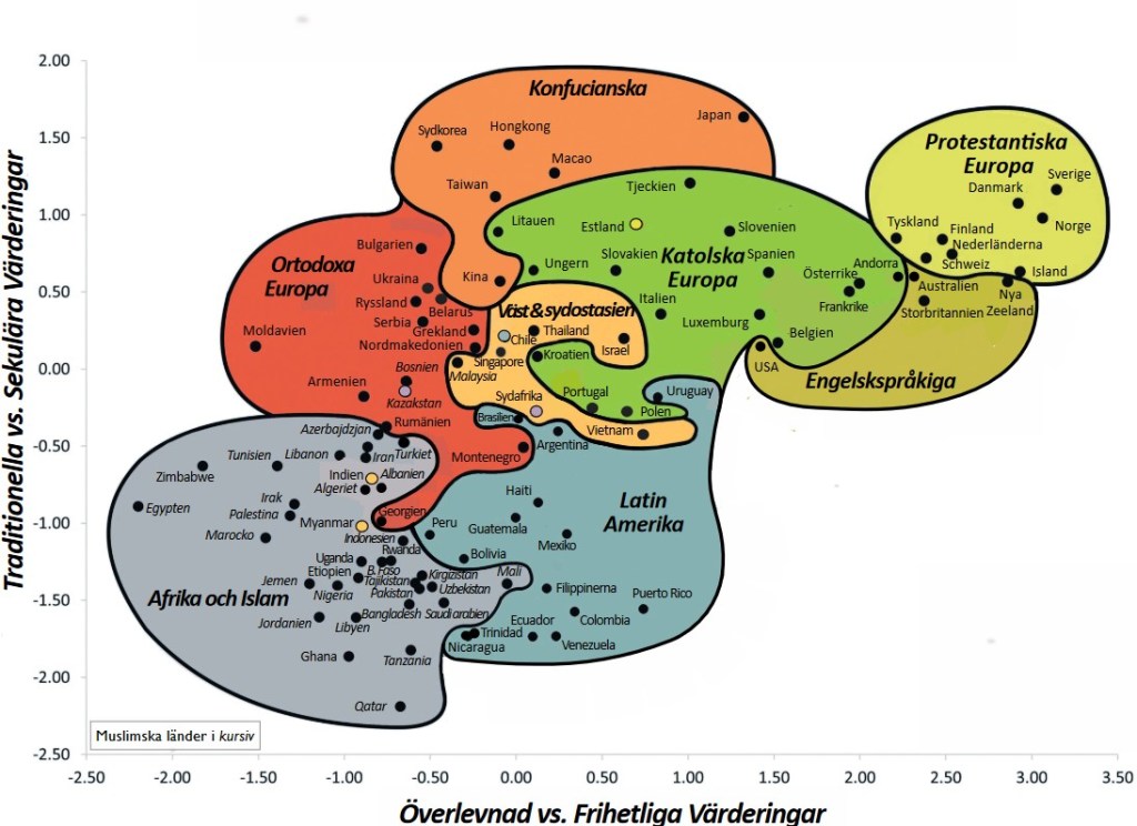 Du känner säkert till den i bilden återgivna Kulturkartan. Den har utarbetats av två sociologer, en amerikan som jobbat på universitet i USA, en tysk som jobbat på universitet i USA och sedan flyttat till det svenska statsfinansierade Institutet för framtidsstudier. Kartan är världsberömd i hela Sverige. (Så har det varit, tror jag, sedan Gunnar och Alva Myrdals tid. De lärde sig amerikanska välfärdsidéer på universitet i USA och tog med dem hem till Sverige där jordmånen för sådana påfund, det vill säga finansieringsmöjligheterna, var mer lovande. Makarna Myrdal var mer insyltade med den socialdemokratiska makten i Sverige vilket underlättade de ekonomiska diskussionerna.)