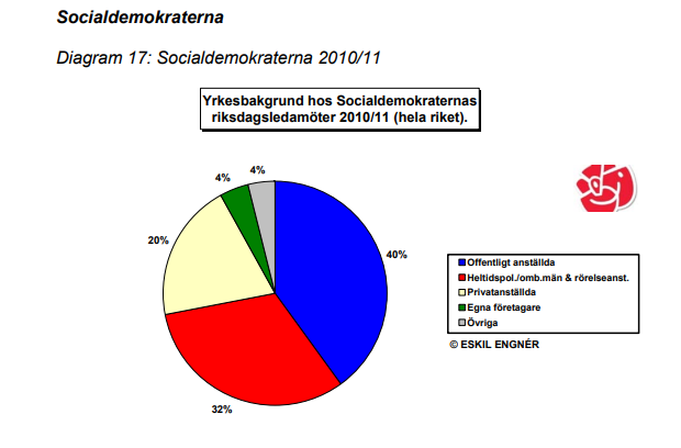 Riksdagen bestod alltså till över femtio procent av folk som härrör från politikerväldet självt och från den offentliga apparaten. Mönstret går igen hos alla partier. Det är lite mindre uttalat hos moderater och sverigedemokrater men särskilt starkt hos miljöpartiet. Här är socialdemokraterna: