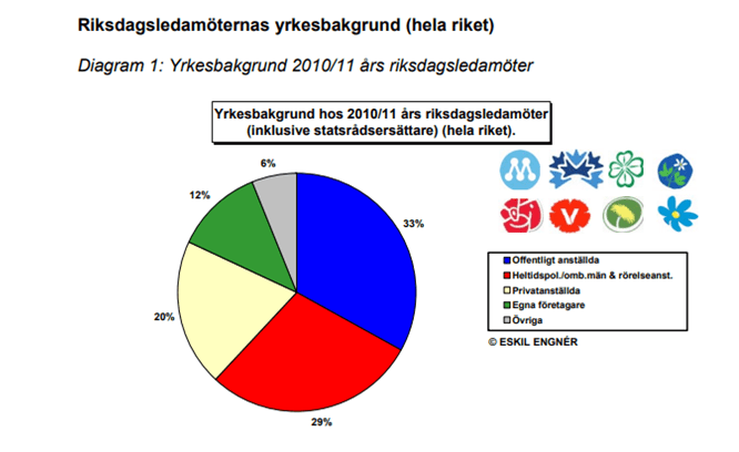 För ett antal år sedan gjorde Eskil Engnér undersökningar av riksdagsledamöternas yrkesbakgrund. Av någon anledning, som man med ett mått av cynism kanske kan gissa sig till, har dessa undersökningar numera upphört. Den senaste avsåg året 2010/11. Så här såg det ut för riksdagen som helhet: