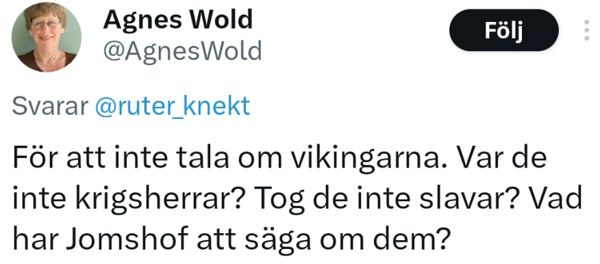 Som ett led i drevet mot Richard Jomshof, för att denne kallat islams profet Muhammed för bland annat ”krigsherre” har den välkända allvetaren Agnes Wold nu gett sig in i debatten och efterlyser ett yttrande från Jomshof om – vikingarna.