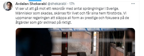 Ardalan Shekarabi, tidigare minister i S-regeringen och en floskelmaskin som nästan kan mäta sig med Morgan Johansson, oroar sig nu över de många sprängningarna som skakar Sverige. Plötsligt är den kriminalitet, som man tidigare avfärdat som ”inbillning” från medborgarnas sida, ett problem. Därför uppmanar Shekarabi regeringen att ”släppa all form av prestige” och satsa på åtgärder som ”gör skillnad”. Vi som varit med ett tag vet redan vad dessa åtgärder består av. Vi vet också att de inte fungerar, och att de aldrig har gjort det. Shekarabis eget parti har bidragit starkt till det kaosläge vi befinner oss i men exministern svamlar och skyller ifrån sig.
