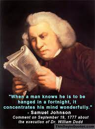 Märkvärdigt nog har det inte alltid varit på det sättet. När invandringschocken nådde Sverige år 2015 greps nationen under några månader av ganska nyttiga panikkänslor. (Ja, djup oro kan skärpa tankarna vilket den engelske 1700-talsförfattaren Samuel Johnson (bilden) formulerade så här: När man vet att man kommer att bli hängd om en vecka så tänker man så mycket klarare.) Jag minns hur den nyväckta oron över tiotusentals eller fler nyanlända i veckan framkallade tankar som samhället ännu inte hunnit förbjuda. Man insåg behovet av ett förstärkt våldsmonopol under demokratisk kontroll och diskuterade länge möjligheten att mobilisera armén för att gripa in där polisens krafter inte räckte. Om jag minns rätt anslöt sig statsminister Löfven till förespråkarna för en sådan lösning.