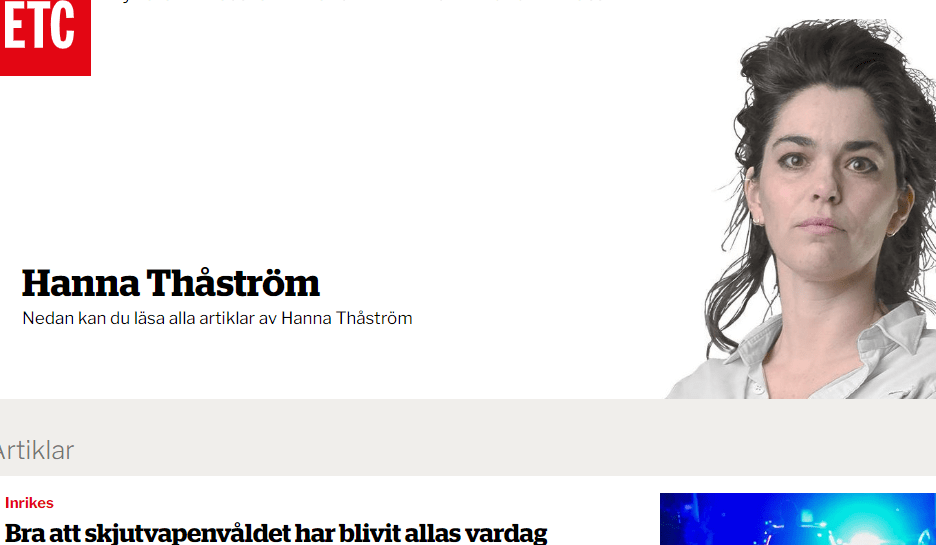 Det är Hanna Thåström, nyhetschef på vänstertidningen ETC, som brassar på med folkföraktet under rubriken ”Bra att skjutvapenvåldet har blivit allas vardag”. Eftersom jag verkligen inte vill slösa pengar på att låsa upp artikeln är det också det enda jag har läst, men det räcker för att förstå vart människan vill komma. Vanligt folk – skötsamma medborgare – förtjänar att omges av skjutvapenvåld.
