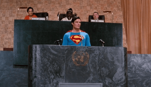 BILD: Stålmannen håller tal på FN-högkvarteret i New York i filmen Superman IV: The Quest for Peace (1987).