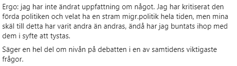 Hon kunde lika gärna ha skrivit att hennes skäl varit mer ädla än andras för det är exakt det hon menar. Men på vilket sätt just hennes kritik mot den restriktionslösa invandringspolitiken är finare än andras förklarar hon inte. Det vet hon förmodligen inte själv. Hon vet bara att hon är lite bättre, godare och finare än andra.