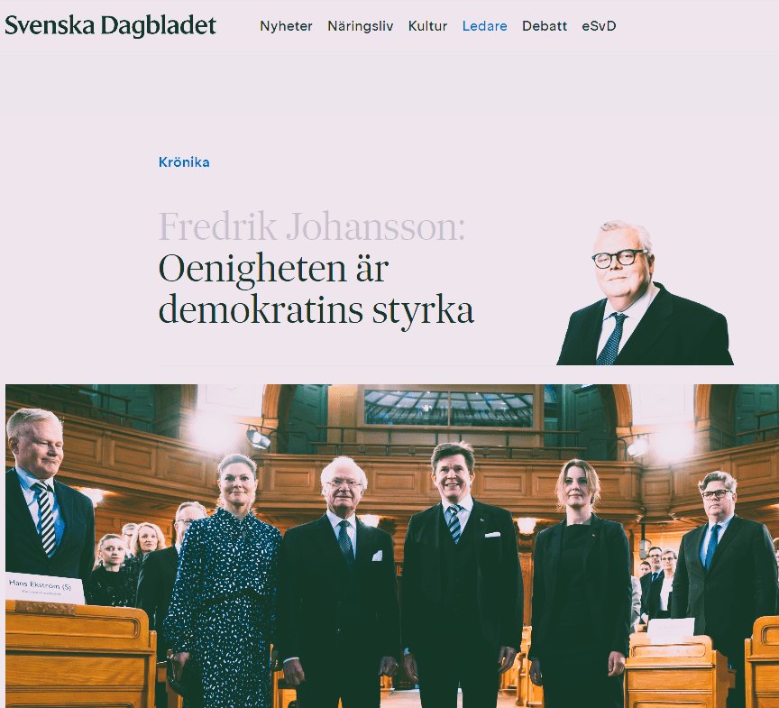 Svenska Dagbladets ledarsida uppmärksammar den 23 mars den här processen utan att för den sakens skull notera att något av en revolution faktiskt inträffade när de samlade politikerna från alla partier – nu med samma existensvillkor, samma löner etc – kastade masken och framträdde som det politikervälde de gradvis blivit. När de nya folkvalda makthavarna blivit varma i kläderna gjorde de som alla makthavare: de skaffade sig mer makt, här kallat demokrati. I ledarartikeln redovisas bland annat konstitutionsutskottets ordförande, socialdemokraten Hilding Johanssons bergfasta övertygelse att politikerväldet var på rätt väg: