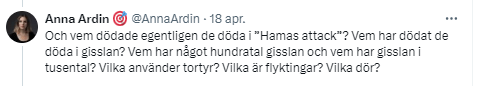 ”Hamas attack” inom citattecken, och de retoriska frågorna (som hon tror ska få henne att verka särskilt upplyst och insatt) betyder bara en sak, nämligen att Anna Ardin vill förmedla att det är Israel som själva genomfört terrordådet den 7 oktober. Hennes lättsinniga kommentar om gisslan säger dessutom att hon inte bryr sig ett skvatt om de kvinnor och barn som kidnappats av terrorister. Tycker hon ens att Hamas är en terrororganisation? Tveksamt.