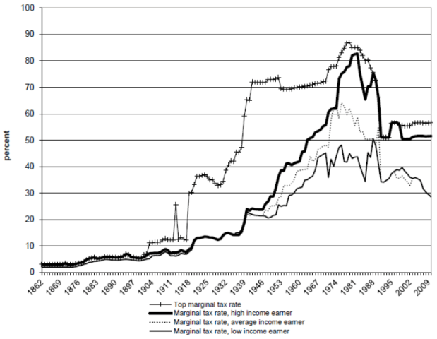 Ett antal klara observationer kan göras. Den första är att marginalskattehöjningarna alltså satte igång så fort den allmänna rösträtten var införd; när kvinnorna sedermera fick rösträtt tog den högsta marginalskattesatsen ett rejält skutt uppåt från strax över tio procent till 30 procent. Den andra observationen är att skattehöjningarna i huvudsak drabbade de rika fram till strax före andra världskriget. Den tredje är att utvecklingskurvan tycks opåverkad av vilka partier som satt i regeringen, dock att skattehöjningarna för låg- och medelinkomsttagare tog fart först efter det socialdemokratiska makttillträdet 1932. En fjärde observation, som inte framgår av diagrammet, är att Sverige som vanligt inte var ensamt. Även andra länder, till exempel Storbritannien, hade motsvarande marginalskatter vilket exempelvis föranledde den kände artisten Mick Jagger att 1971 lämna sitt hemland som skatteflykting.