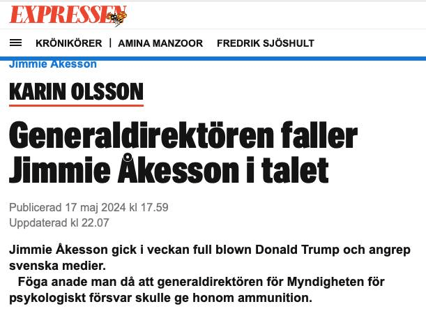 Mest blir jag väl road av att Expressens tidigare kulturchef Karin Olsson inte behärskar svenska språket när hon lanserar sina konspirationsteorier i en krönika. Hon hävdar att Magnus Hjorth, som basar över Myndigheten för psykologiskt försvar ”fallit Åkesson i talet” när han anmäler TV4:s Kalla Fakta till Granskningsnämnden.