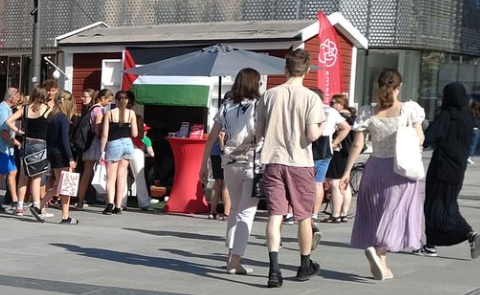 Bredvid Socialdemokraternas valstuga finns även en fristående palestinsk, bemannad av en kysk kvinna som är täckt i svart från topp till tå.