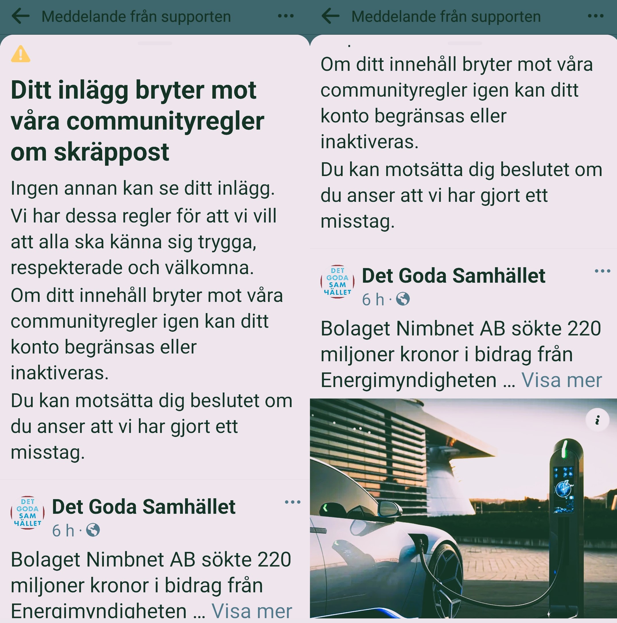 Bilderna visar exempel på hur Facebooks besked om borttagning ser ut. Exempelbilderna rör två artiklar av Bitte Assarmo som moderatorerna, eller den artificiella (o)intelligensen, avlägsnade från vår sida.