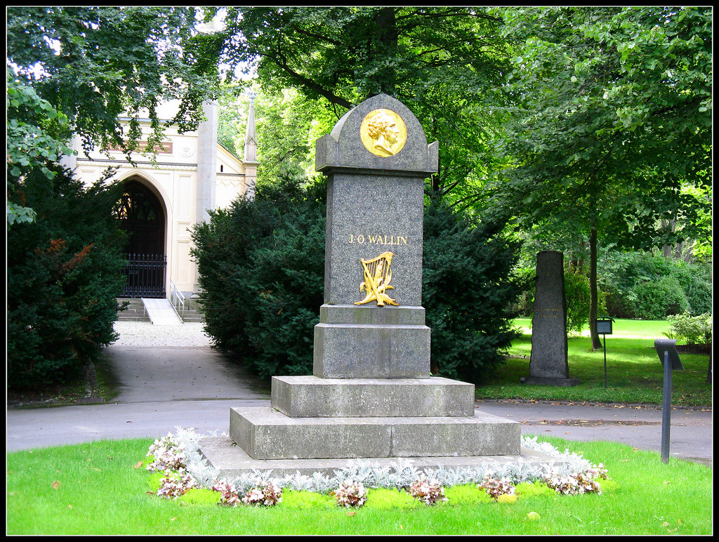 Med utnyttjande av Wallins initialer skrev förresten någon en bevingad vers som påstås vara inhuggen i gravstenen även om jag inte kan se det på bilden: ”Jordens Oro Wiker, för den frid som varar, grafven allt förliker, himlen allt förklarar”.