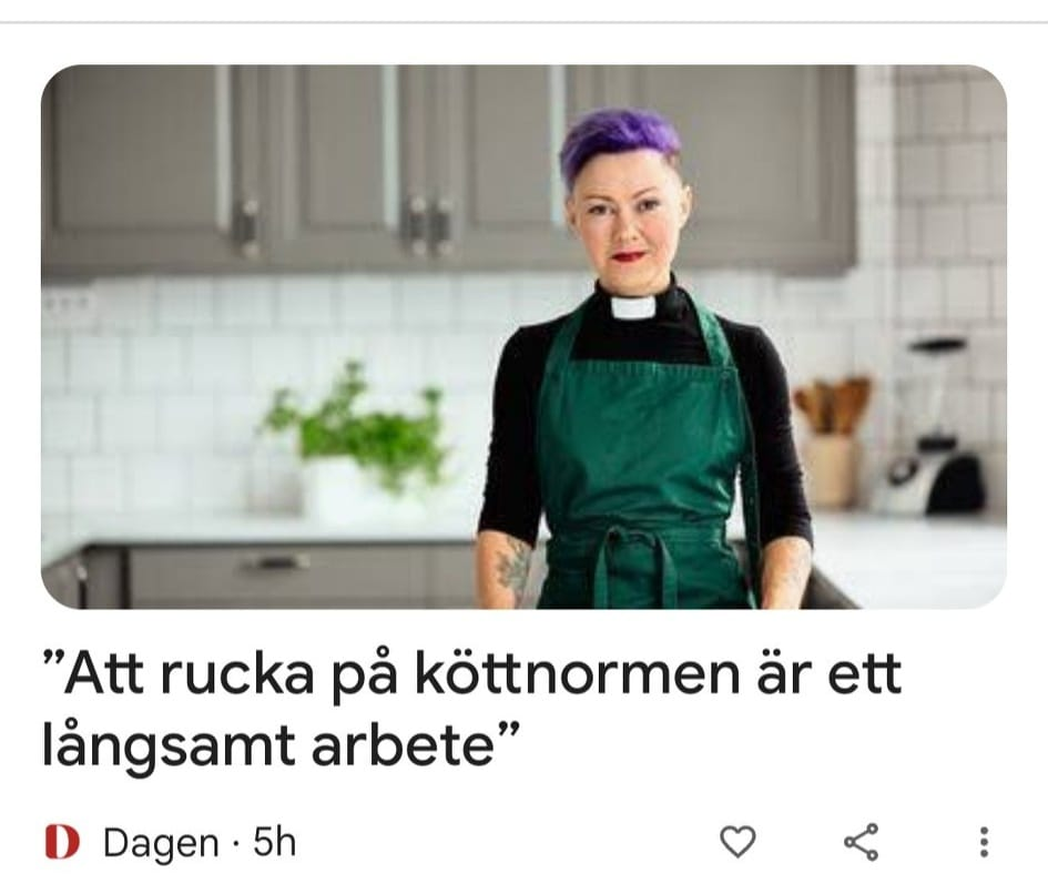 Det är inte bara könsrollerna som ska utmanas. Svenska kyrkan tar också ställning mot köttätande. På bilden nedan syns prästen Jennie Högberg – chic i lila punkfrisyr och med mängder av coola tatueringar – i en artikel i tidningen Dagen. Hon har nyss gett ut ”Kyrkans gröna kokbok” (som om det bara fanns en enda kyrka i Sverige).