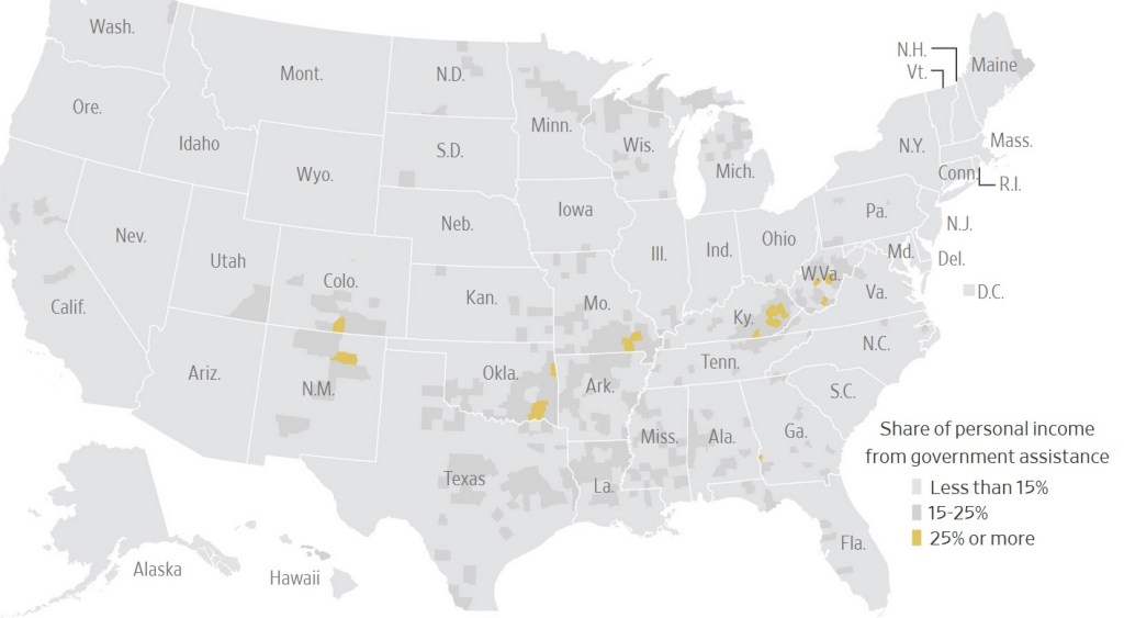 Här följer tre talande illustrationer över vilka av landets ”counties” (det finns 3 000 stycken och liknar mest svenska kommuner) där mindre än 15 procent, 15 – 25 procent respektive mer än 25 procent av folks inkomster kommer från olika välfärdsprogram. Välfärdsinkomsterna har vuxit tre gånger så fort som övriga inkomster under det senaste halvseklet.