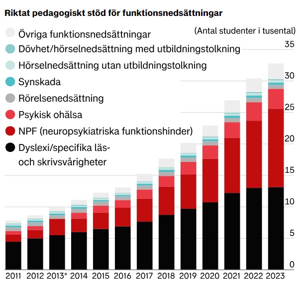 I diskrimineringslagen står det att utbildningsanordnare måste vidta ”skäliga” åtgärder för att en elev med funktionsnedsättning ska tävla på lika villkor med elever utan funktionsnedsättning. Men vad är ”skäliga”? Om man frågar eleverna är det bara fantasin som sätter gränserna och om man frågar det omsättningsmaximerande välfärdsindustriella komplexet finns det alltid mer pengar i statskassan för angelägna ändamål. För tjugo år sedan kostade det riktade pedagogiska stödet för funktionsnedsättningar 44 miljoner kronor. Idag ligger kostnaden för skattebetalarna på 134 miljoner.