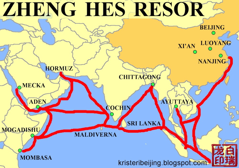 Men låt oss stanna vid ordet ”återuppstående” och gå tillbaka i historien. År 1421 seglade den kinesiska amiralen Zheng He med den största flottan världen någonsin skådat ut i Indiska Oceanen, till ”världens ende” för att kräva tribut från de ”barbariska” länder de besökte. Nu talar vi om betydligt större och mer avancerade fartyg än de som Kolumbus 1492 nästan ett sekel senare upptäckte Amerika. I boken ”1421 – The Year China Discovered America”, 2002, av Gavin Menzzies (1937 – 2020) påstår han att flottan (eventuellt) seglade hela jorden runt. Sanningen är i vart fall att de seglade runt Indiska Oceanen och till Afrika.