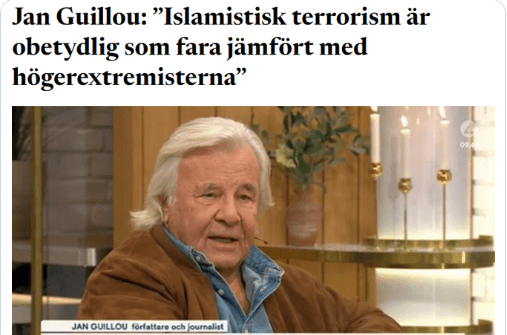 Kommunisten och islamistvännen Jan Guillou har bjudits in till tv igen, för att göra reklam för sin nya bok och för att säga några väl valda ord om den fredliga och ofarliga islamismen. Islamistisk terror är intet jämfört med den sverigedemokratiska terrorn och i hans nya bok får SD:s Jessica Stegrud, under namnet Stegeryd, spela rollen som nazistledare.