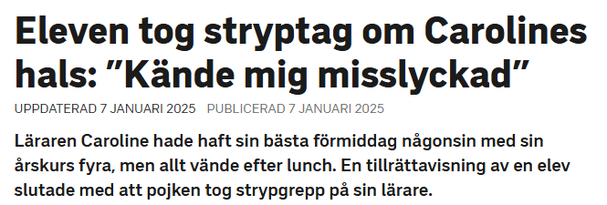 Ser ett inslag på SVT Nyheter om en lärare som blivit attackerad av en elev. Eleven tog stryptag på läraren, med resultatet att läraren blev ursinnig, knuffade undan det lilla kräket och genast slängde ut honom ur klassrummet med huvudet före.