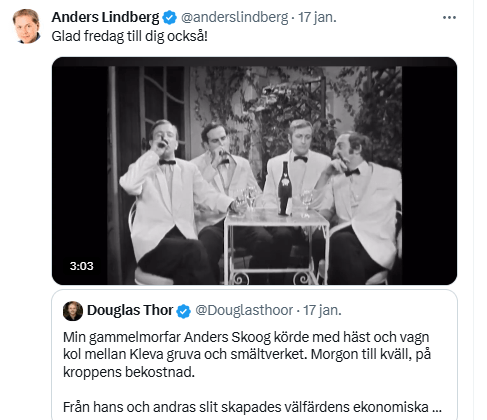 I ett raljant inlägg på X återpublicerar han Douglas Thors inlägg och önskar en glad fredag med ett klipp från Monty Pythons The Four Yorkshiremen, alltså den vansinnigt roliga sketch där fyra överklassmän sitter och fabulerar om barndomens och uppväxtens påstådda vedermödor.