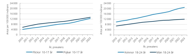 Jag känner på mig att ordet psykfall knappast är politiskt korrekt och att jag borde leta efter någon annan formulering som ej kan väcka anstöt, trygghetsutmanad eller något ditåt, men tills vidare är begreppet psykfall en förståelig och adekvat benämning på dem som lider av psykisk ohälsa varmed Folkhälsomyndigheten menar personer som under ett år fått ”psykiatrisk diagnos inom specialiserad vård” eller gjort ”minst ett besök inom psykiatrin (där diagnos nödvändigtvis inte ställdes)” eller gjort ”uttag av psykofarmaka”. Enligt följande graf har andelen sådana psykfall bland unga människor dubblats eller tredubblats under de senaste femton åren.